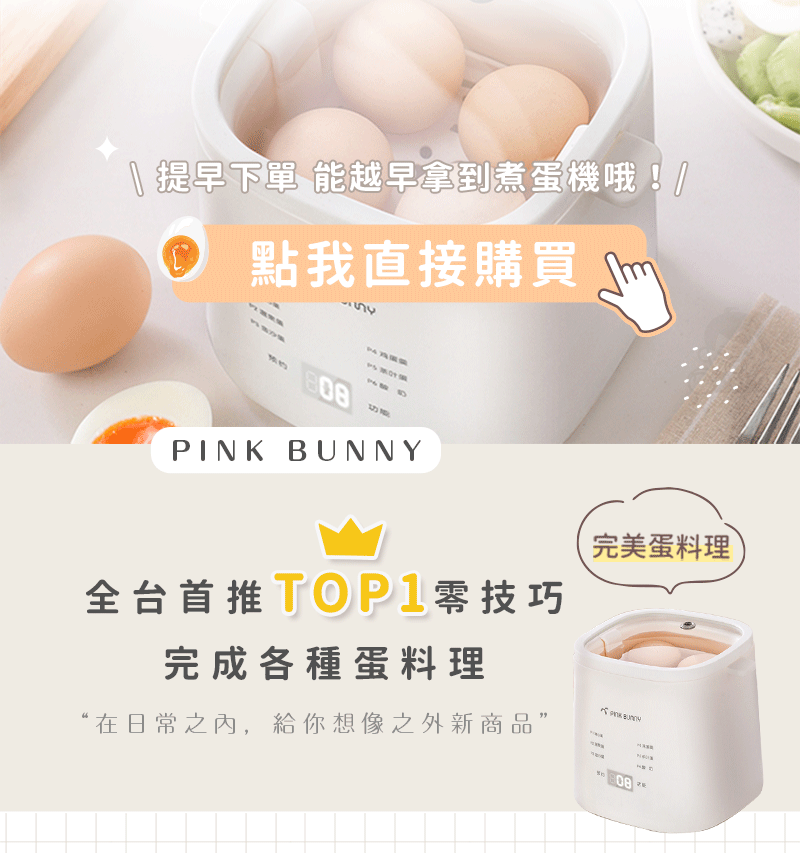 15分鐘前Pink Bunny智能煮蛋機智能控溫烹煮,營養美味輕鬆上桌 - Pink Bunny智能煮蛋機2入組 NT$1990
